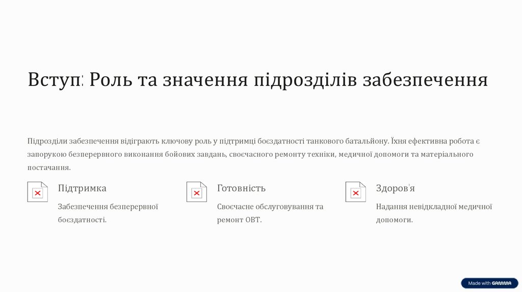 Вступ: Роль та значення підрозділів забезпеченняПідрозділи забезпечення відіграють ключову роль у підтримці боєздатності танкового батальйону. Їхня ефективна робота є