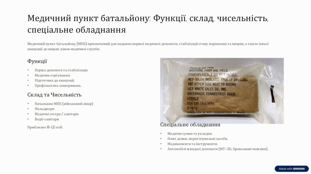 Медичний пункт батальйону: Функції, склад, чисельність,спеціальне обладнання