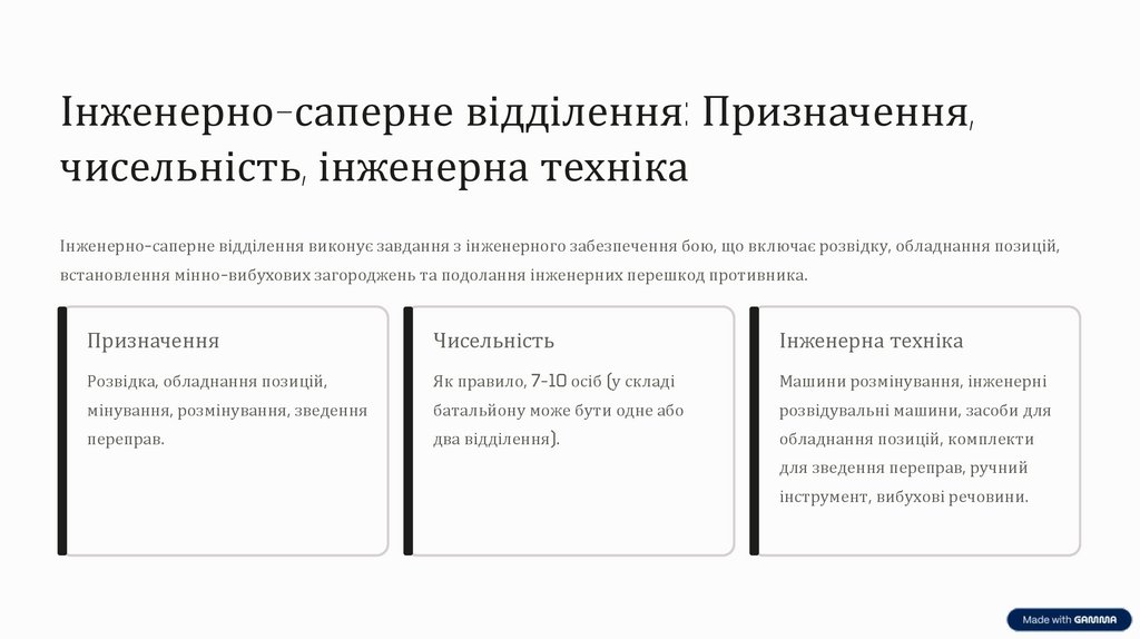 Інженерно-саперне відділення: Призначення,чисельність, інженерна техніка