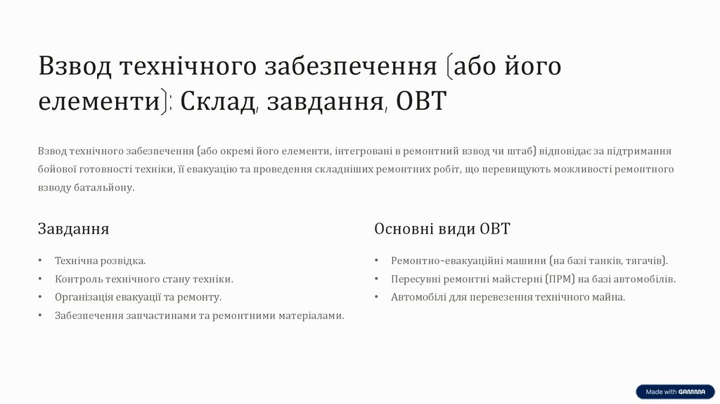 Взвод технічного забезпечення (або йогоелементи): Склад, завдання, ОВТ
