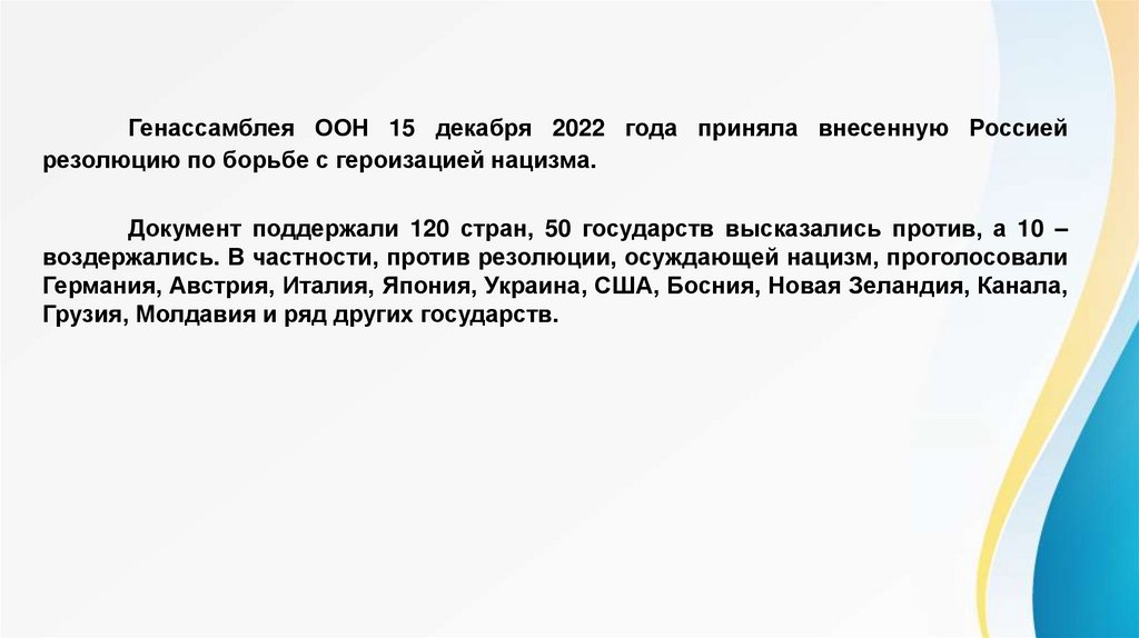 Генассамблея ООН 15 декабря 2022 года приняла внесенную Россиейрезолюцию по борьбе с героизацией нацизма.