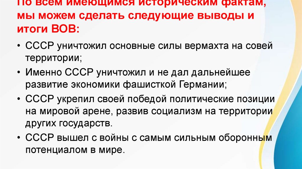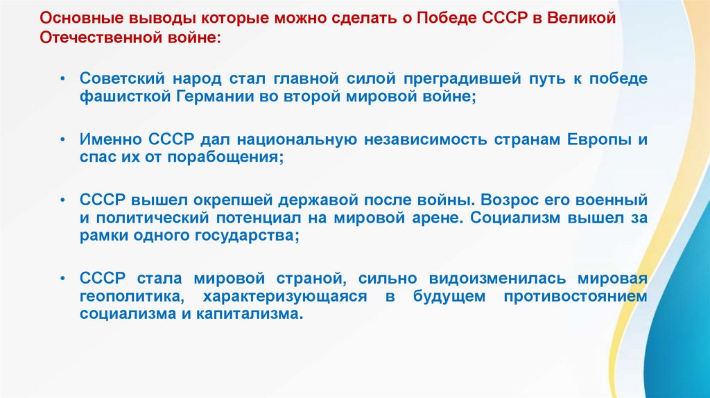Основные выводы которые можно сделать о Победе СССР в ВеликойОтечественной войне: