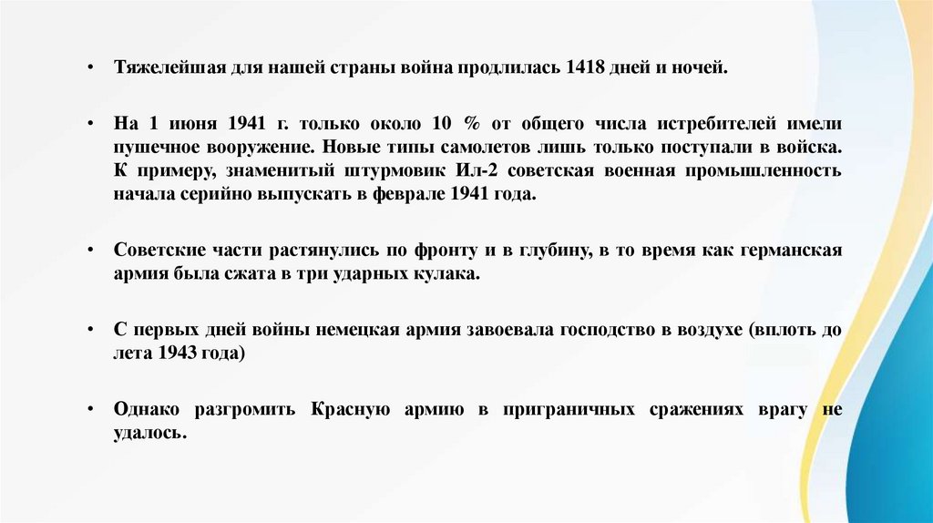 • Тяжелейшая для нашей страны война продлилась 1418 дней и ночей.• На 1 июня 1941 г. только около 10 % от общего числа истребителей имели