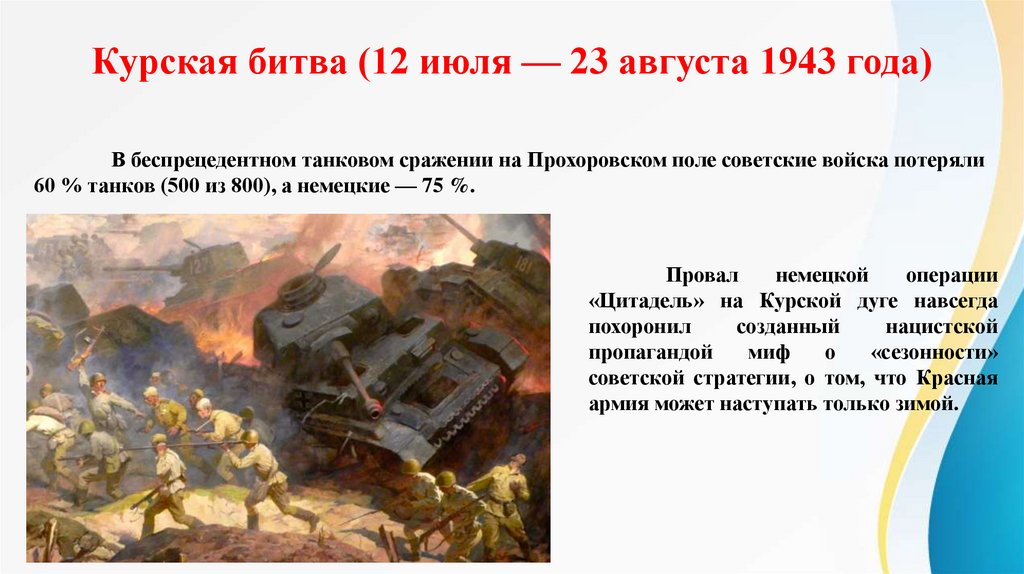 Курская битва (12 июля — 23 августа 1943 года)В беспрецедентном танковом сражении на Прохоровском поле советские войска потеряли