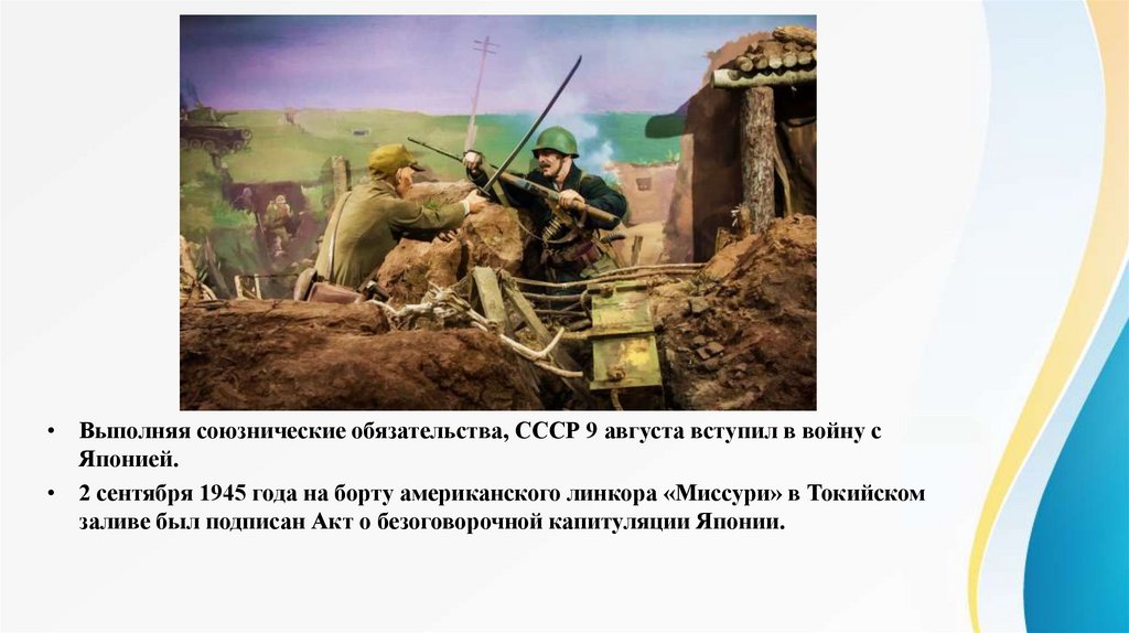 • Выполняя союзнические обязательства, СССР 9 августа вступил в войну сЯпонией.