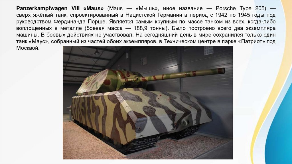 Panzerkampfwagen VIII «Maus» (Maus — «Мышь», иное название — Porsche Type 205) —сверхтяжёлый танк, спроектированный в Нацистской Германии в период с 1942 по 1945 годы под