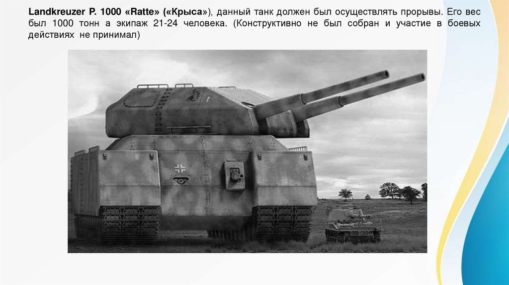 Landkreuzer P. 1000 «Ratte» («Крыса»), данный танк должен был осуществлять прорывы. Его весбыл 1000 тонн а экипаж 21-24 человека. (Конструктивно не был собран и участие в боевых