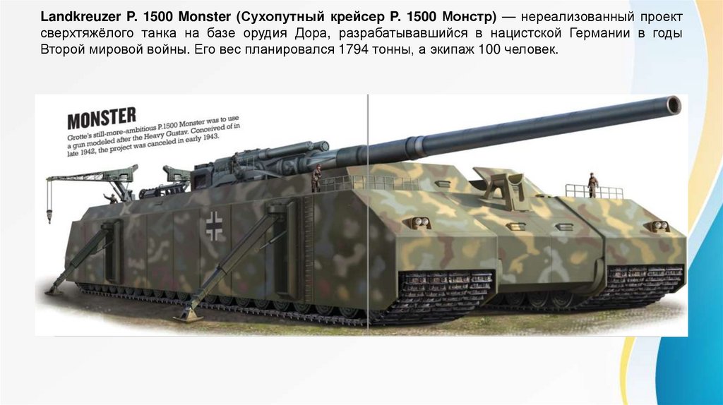 Landkreuzer P. 1500 Monster (Сухопутный крейсер P. 1500 Монстр) — нереализованный проектсверхтяжёлого танка на базе орудия Дора, разрабатывавшийся в нацистской Германии в годы