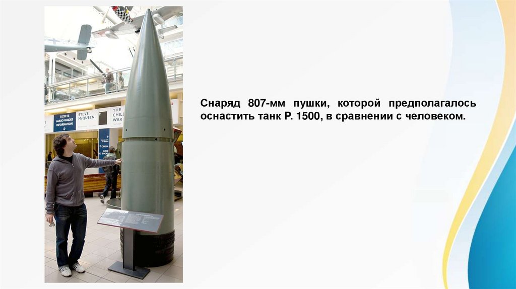 Снаряд 807-мм пушки, которой предполагалосьоснастить танк P. 1500, в сравнении с человеком.
