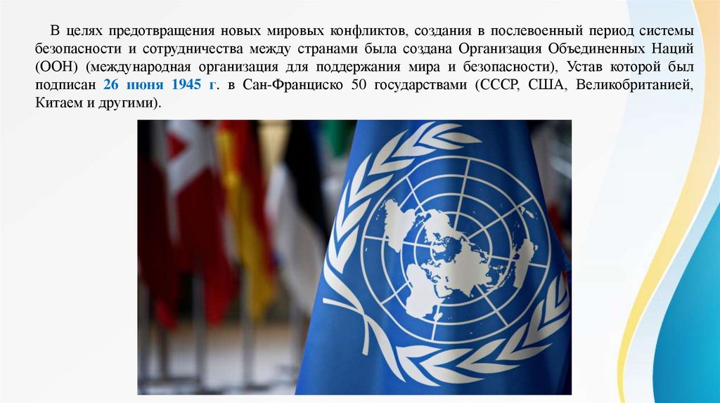 В целях предотвращения новых мировых конфликтов, создания в послевоенный период системыбезопасности и сотрудничества между странами была создана Организация Объединенных Наций