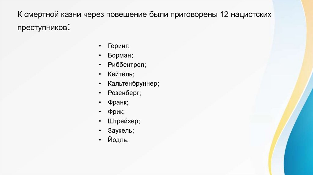 К смертной казни через повешение были приговорены 12 нацистскихпреступников: