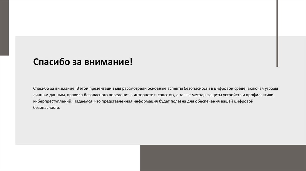 Спасибо за внимание!Спасибо за внимание. В этой презентации мы рассмотрели основные аспекты безопасности в цифровой среде, включая угрозы