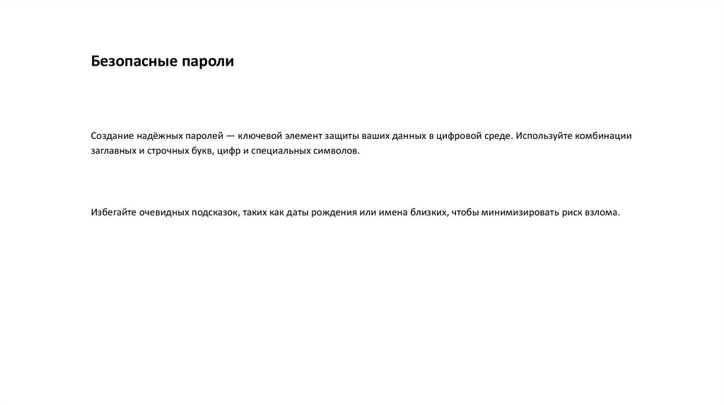 Безопасные паролиСоздание надёжных паролей — ключевой элемент защиты ваших данных в цифровой среде. Используйте комбинации