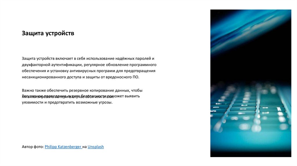 Защита устройствЗащита устройств включает в себя использование надёжных паролей и