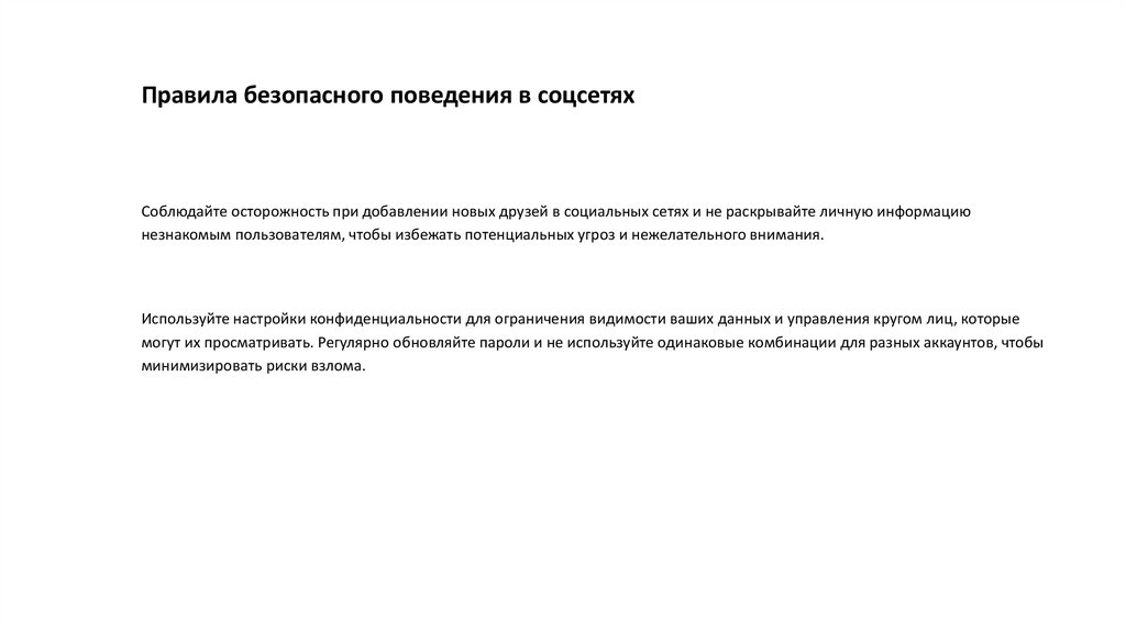 Правила безопасного поведения в соцсетяхСоблюдайте осторожность при добавлении новых друзей в социальных сетях и не раскрывайте личную информацию