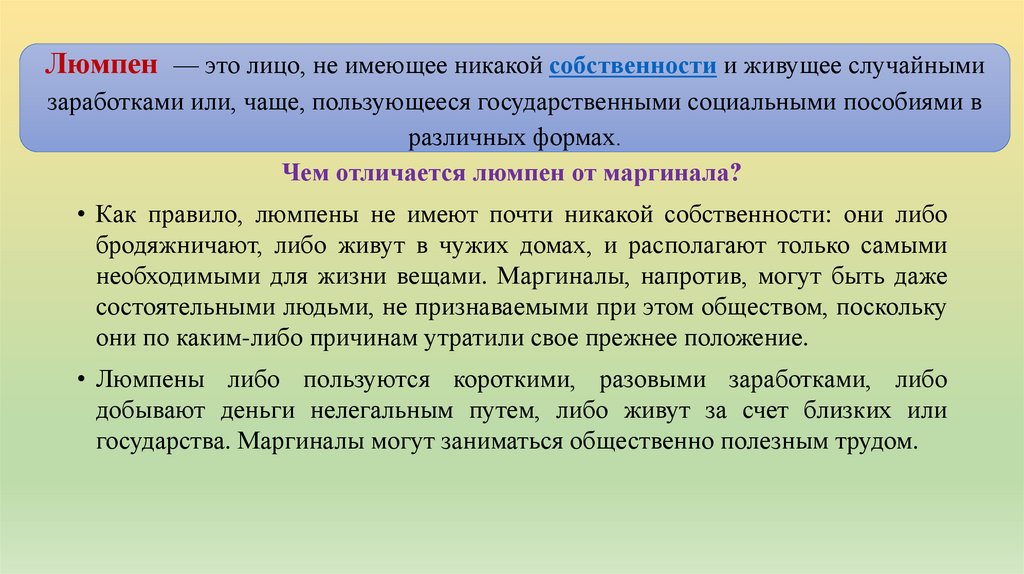 Люмпен — это лицо, не имеющее никакой собственности и живущее случайнымизаработками или, чаще, пользующееся государственными социальными пособиями в