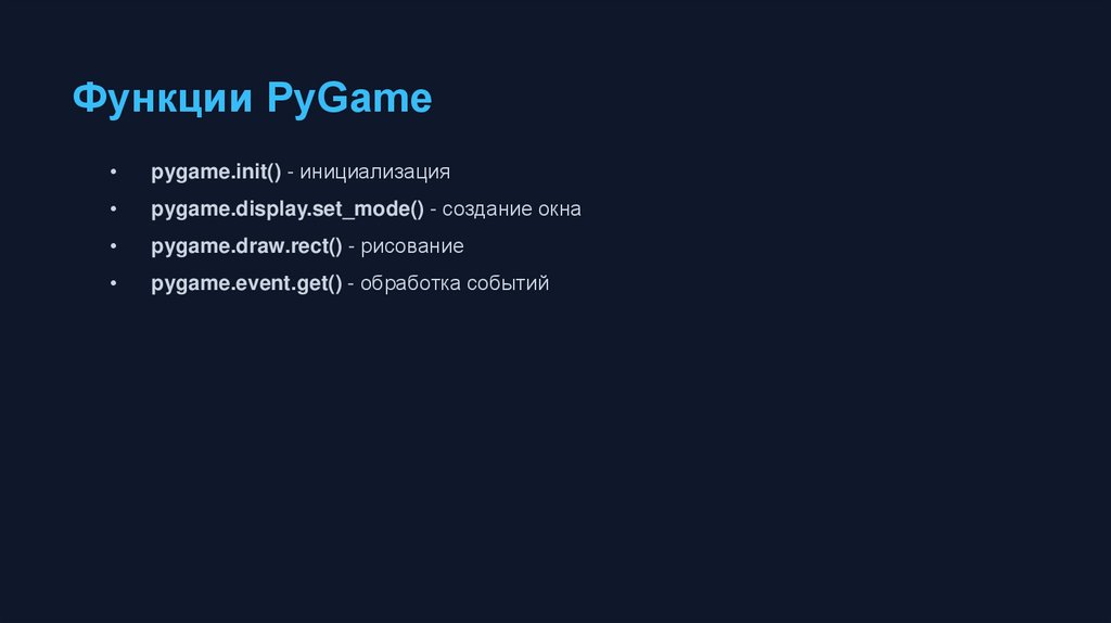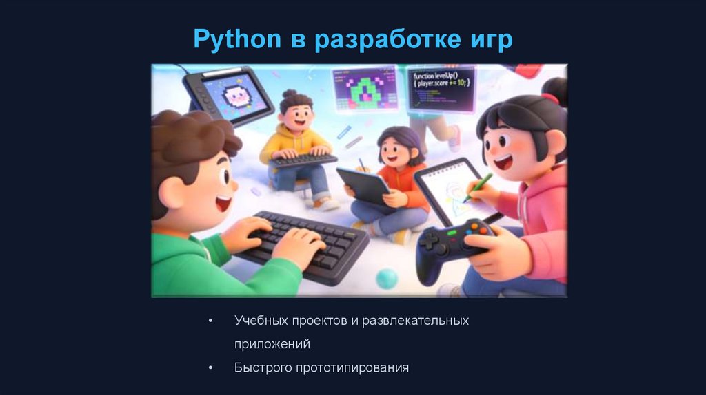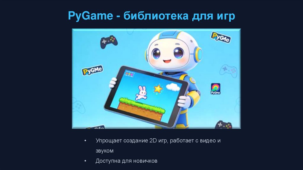 PyGame - библиотека для игрУпрощает создание 2D игр, работает с видео и