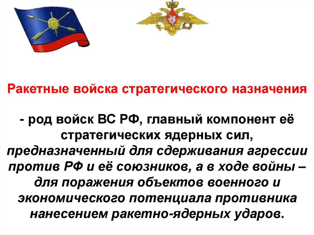 Ракетные войска стратегического назначения- род войск ВС РФ, главный компонент её