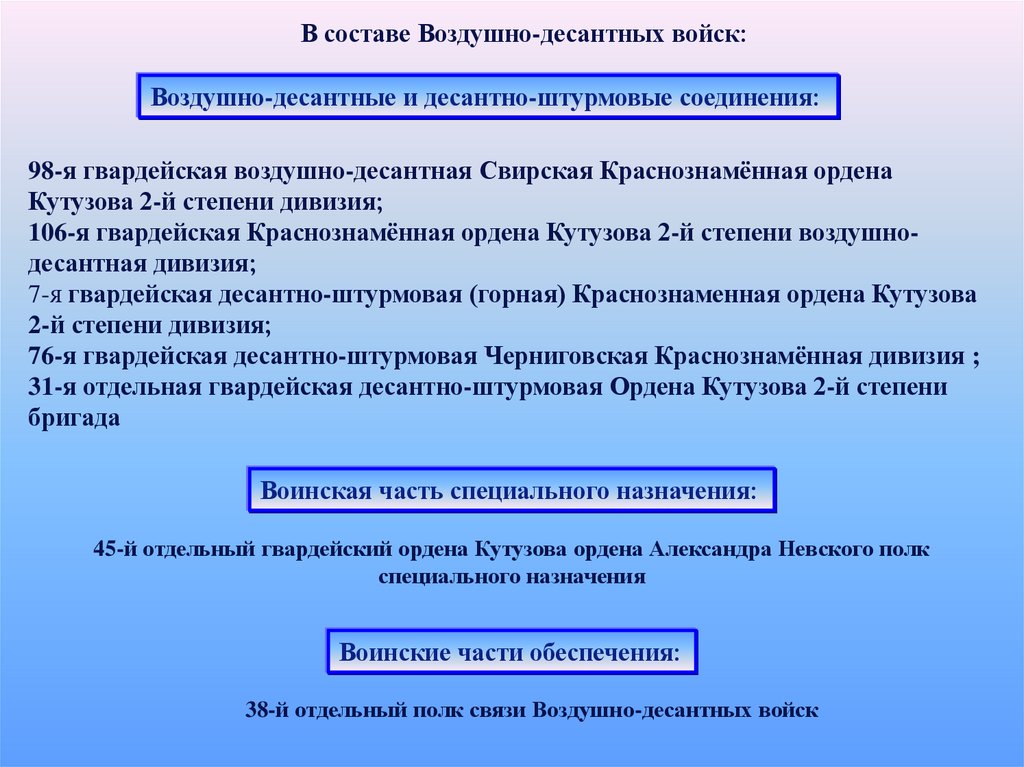 В составе Воздушно-десантных войск:Воздушно-десантные и десантно-штурмовые соединения: