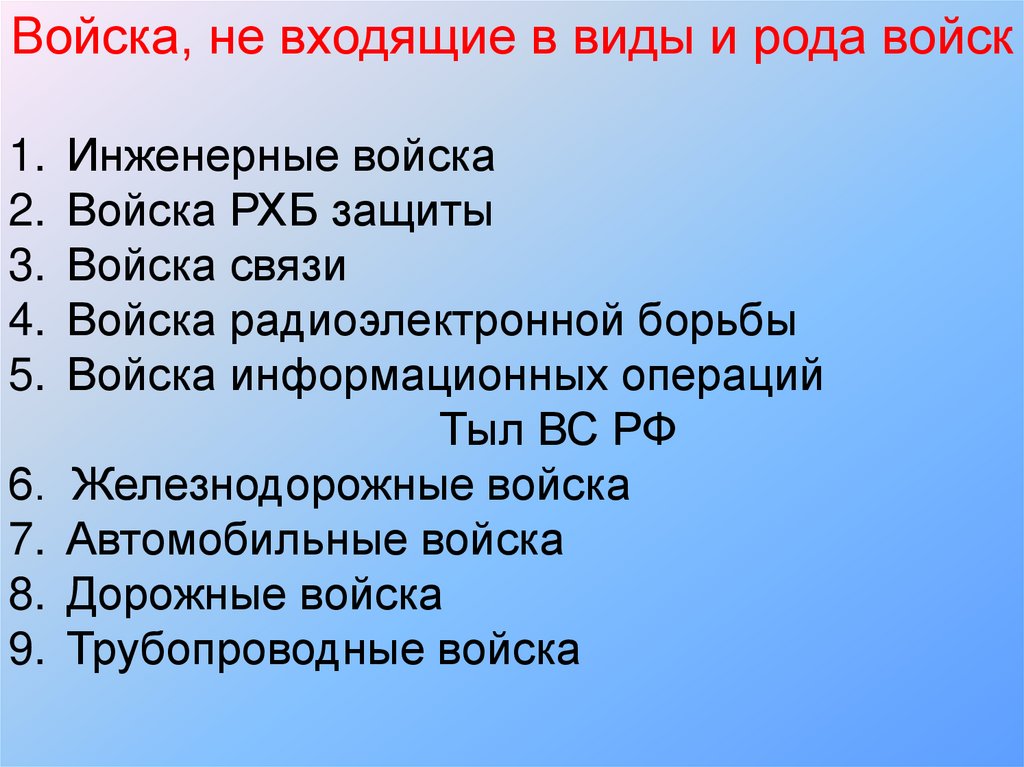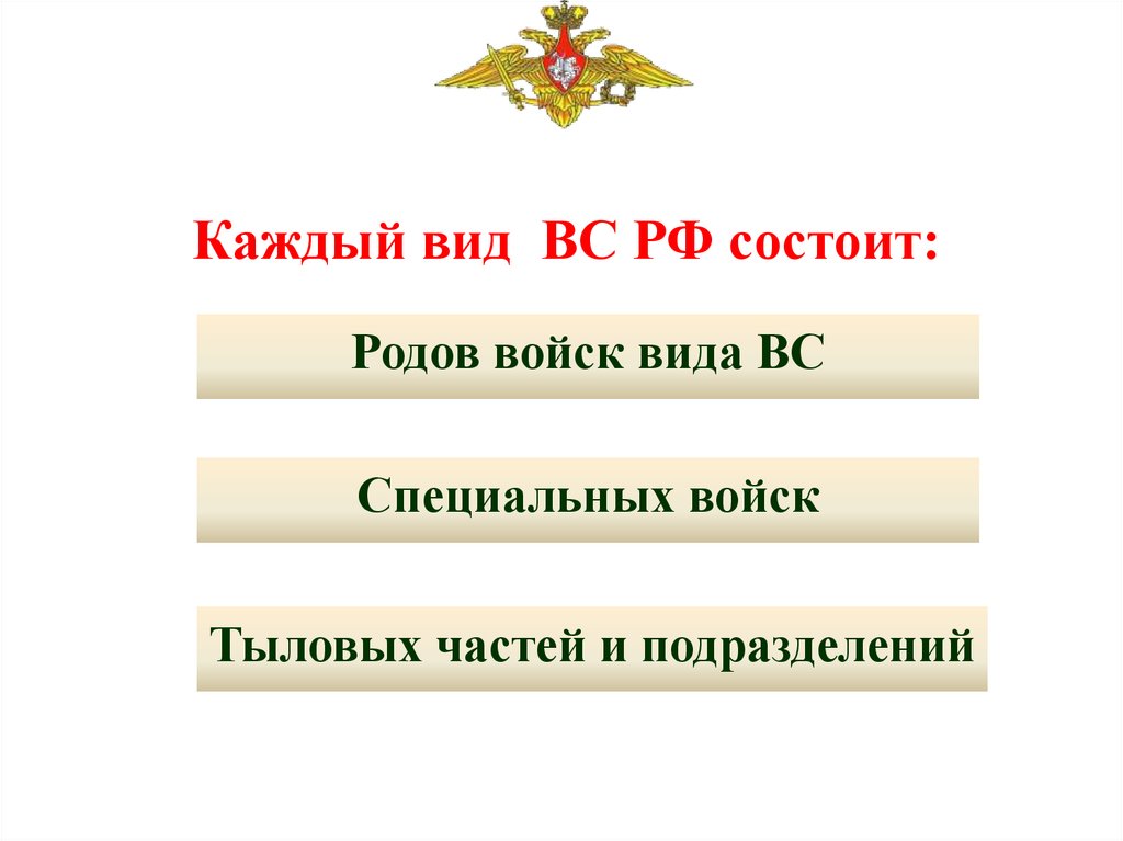 Каждый вид ВС РФ состоит:Родов войск вида ВС
