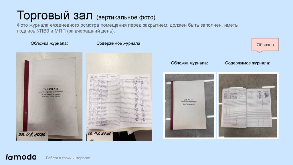 Торговый зал (вертикальное фото)Фото журнала ежедневного осмотра помещения перед закрытием: должен быть заполнен, иметь