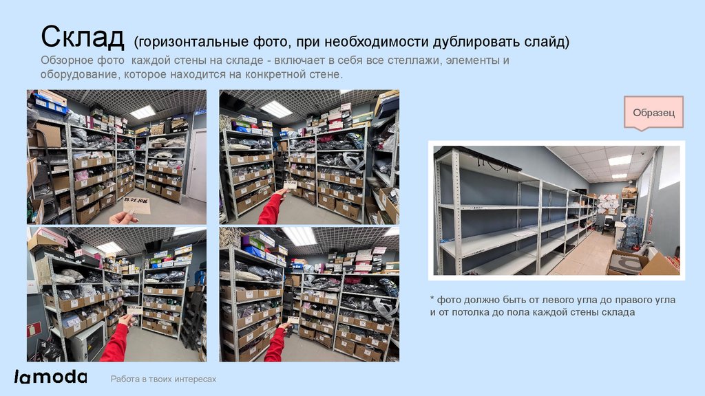 Склад (горизонтальные фото, при необходимости дублировать слайд)Обзорное фото каждой стены на складе - включает в себя все стеллажи, элементы и