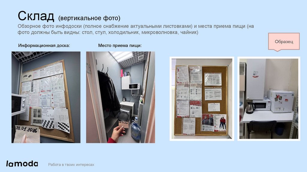 Склад (вертикальное фото)Обзорное фото инфодоски (полное снабжение актуальными листовками) и места приема пищи (на