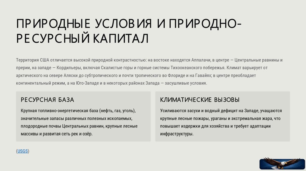 ПР ИРОДНЫЕ УСЛОВ ИЯ И ПР ИРОДНОР Е СУРСНЫЙ КАПИТАЛТерритория США отличается высокой природной контрастностью: на востоке находятся Аппалачи, в центре — Центральные равнины и