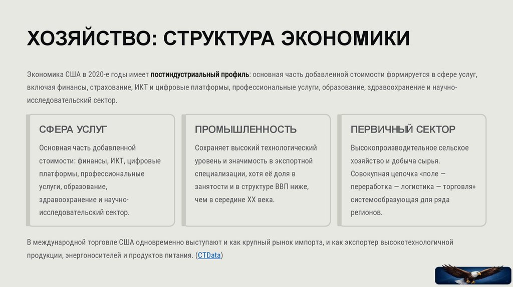 ХОЗЯЙСТВО: СТРУКТУРА ЭКОНОМИКИЭкономика США в 2020-е годы имеет постиндустриальный профиль: основная часть добавленной стоимости формируется в сфере услуг,