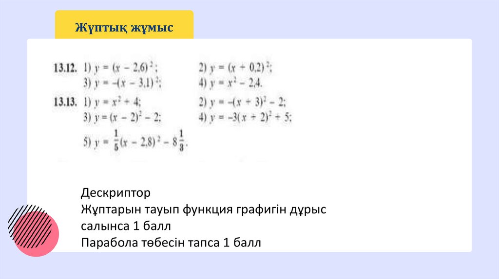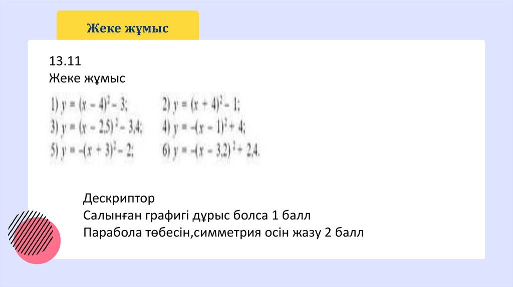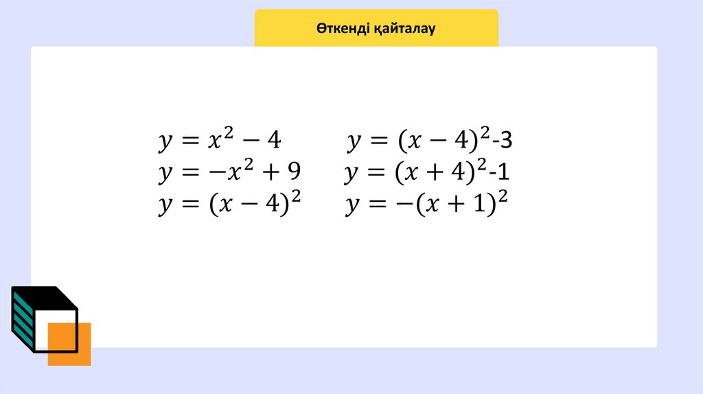 Сабақтың мақсаты: 8.4.1.2 y=a(x-m)^2, y=ax^2+n және y=a(x-m)^2+n, a≠0, түрдегі квадраттық функциялардың қасиеттерін білу және