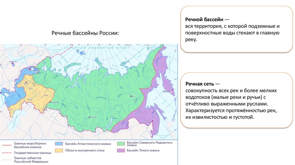 Ледовитого (более 80% всех рек), Атлантического и Тихого океанов, а также к бессточным бассейнам.