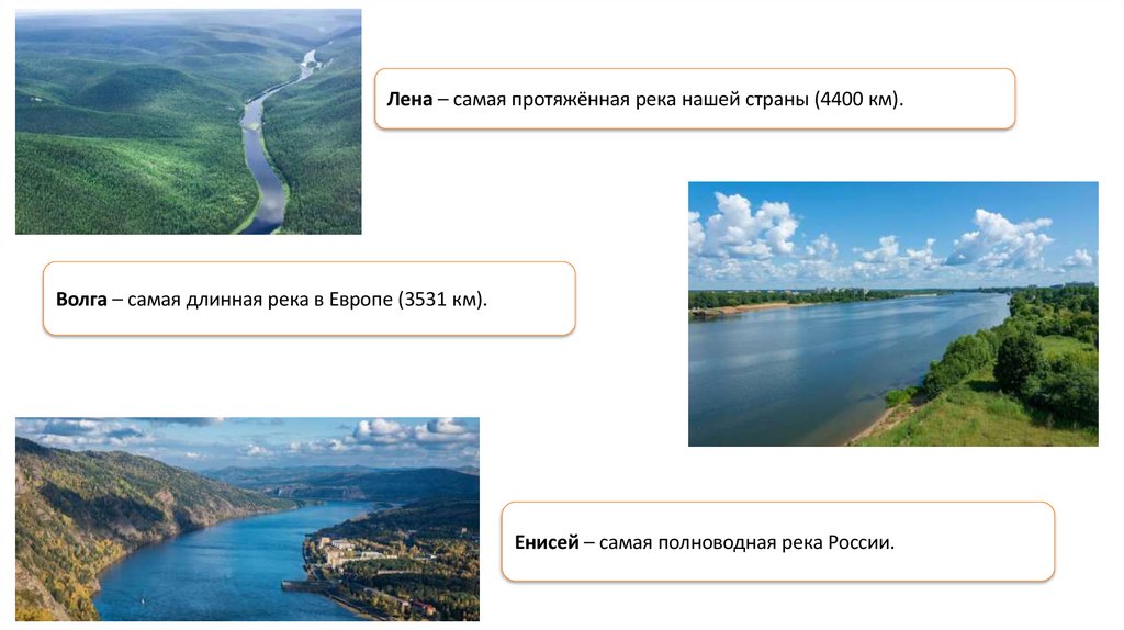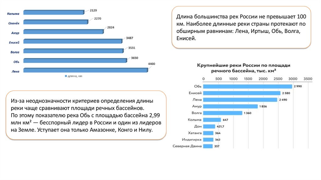 Длина большинства рек России не превышает 100км. Наиболее длинные реки страны протекают по