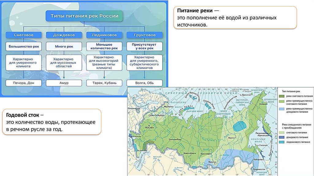 Влияние климата проявляется через источники питания рек и их режим (колебание уровня