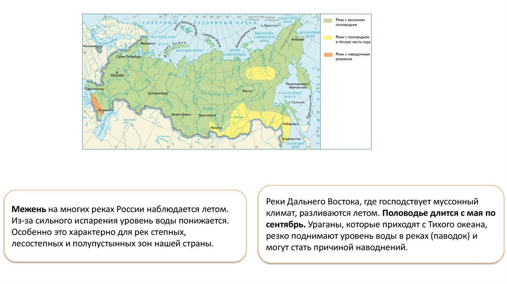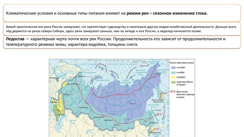 Климатические условия и основные типы питания влияют на режим рек – сезонное изменение стока.Зимой практические все реки России замерзают, что препятствует судоходству и некоторым другим видам хозяйственной деятельности. Дольше всего