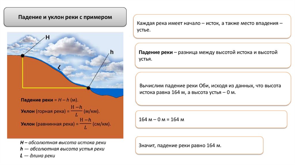 Падение и уклон реки с примеромВычислим уклон реки Оби, зная, что она равнинная и