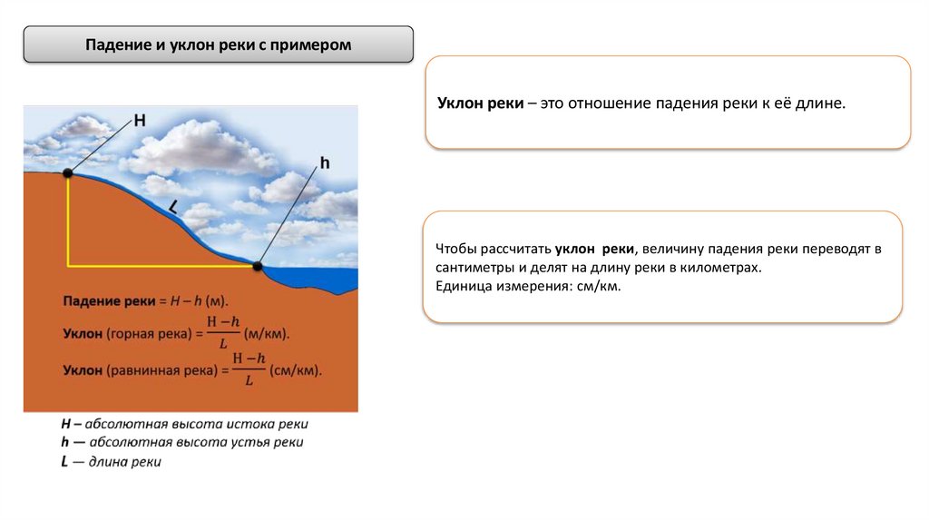 Падение и уклон реки с примеромУклон реки – это отношение падения реки к её длине.