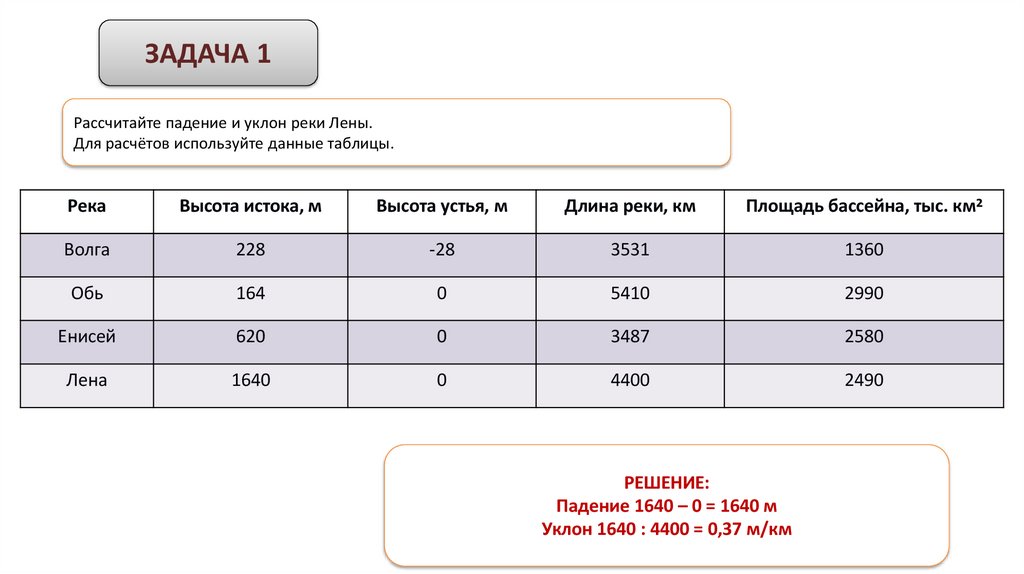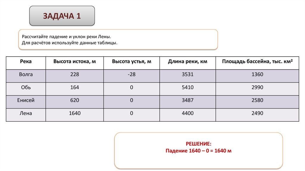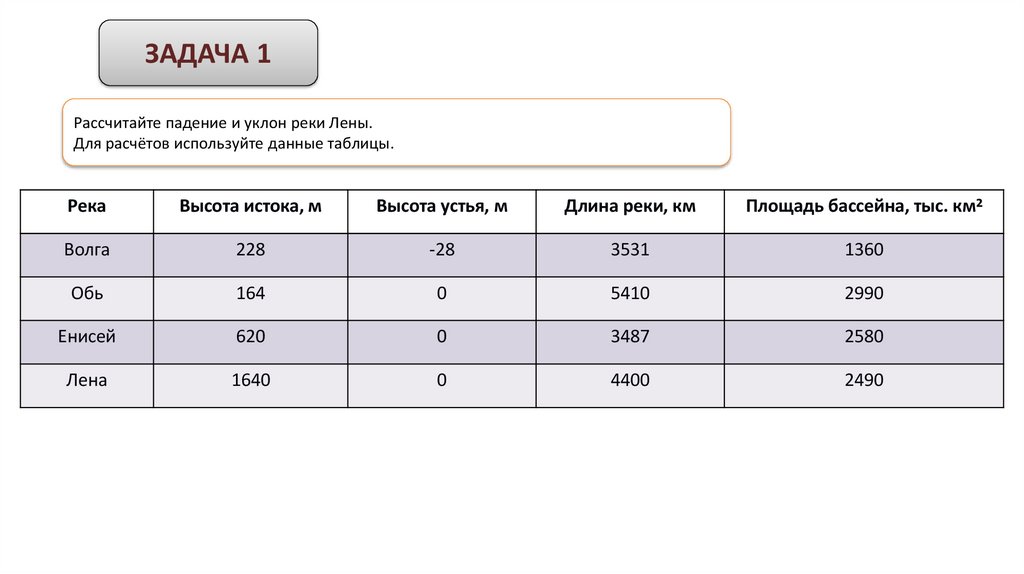 ЗАДАЧА 1Рассчитайте падение и уклон реки Лены.