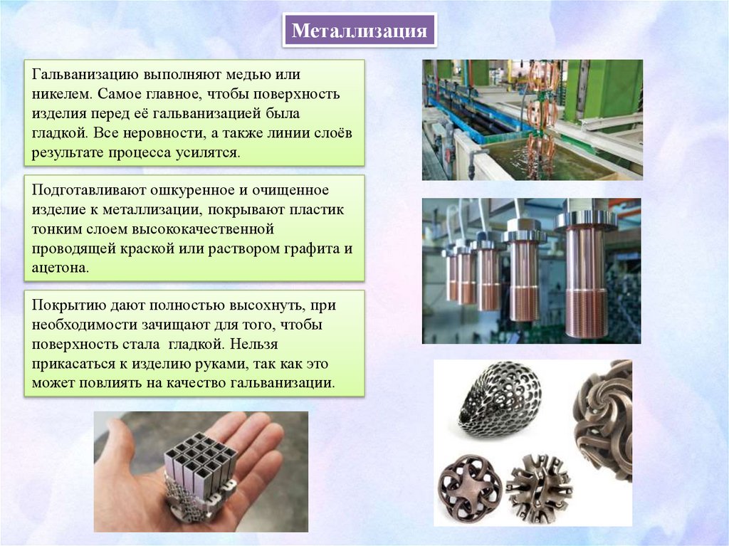 МеталлизацияГальванизацию выполняют медью или