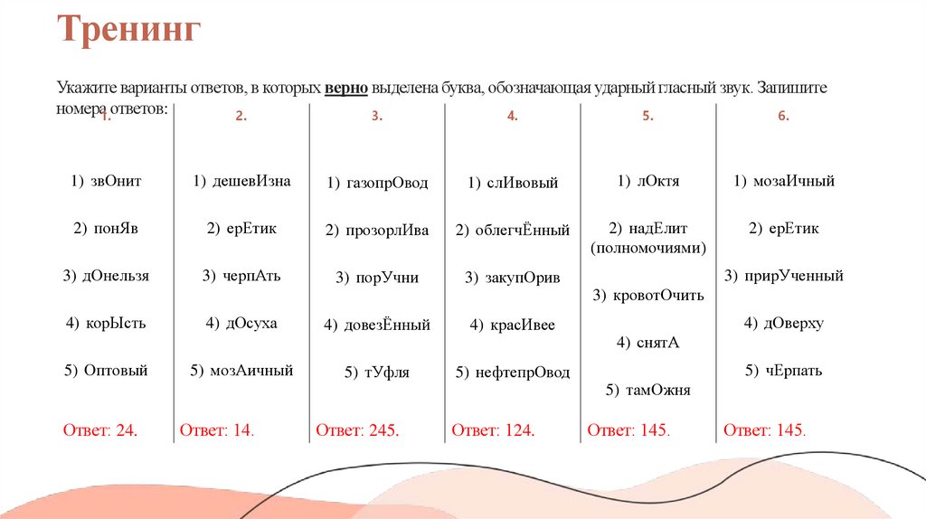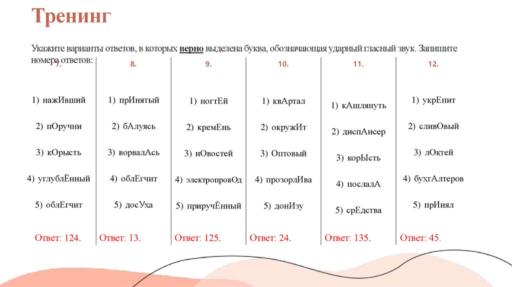 ТренингУкажите варианты ответов, в которых верно выделена буква, обозначающая ударный гласный звук. Запишите