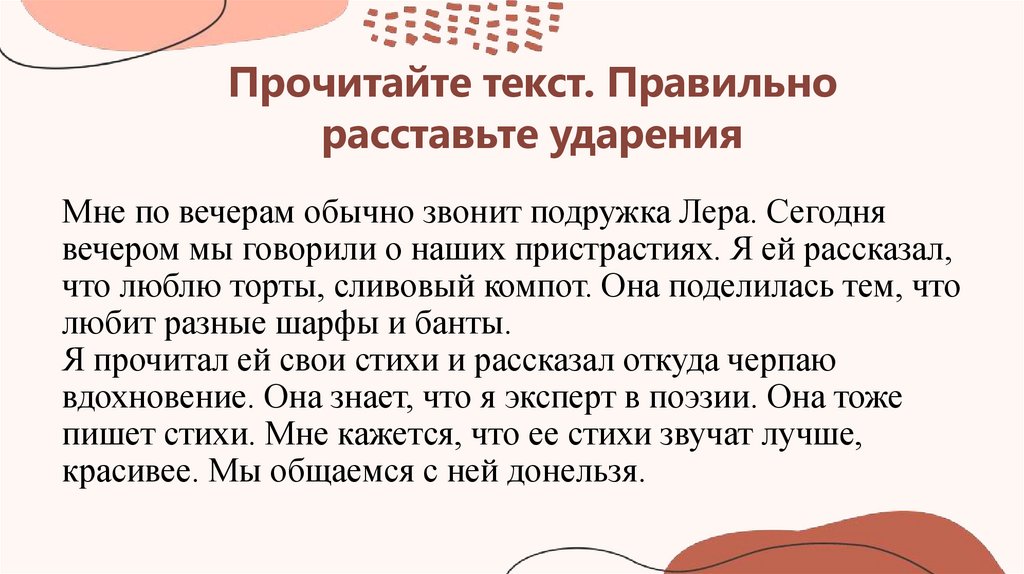 Прочитайте текст. Правильнорасставьте ударения