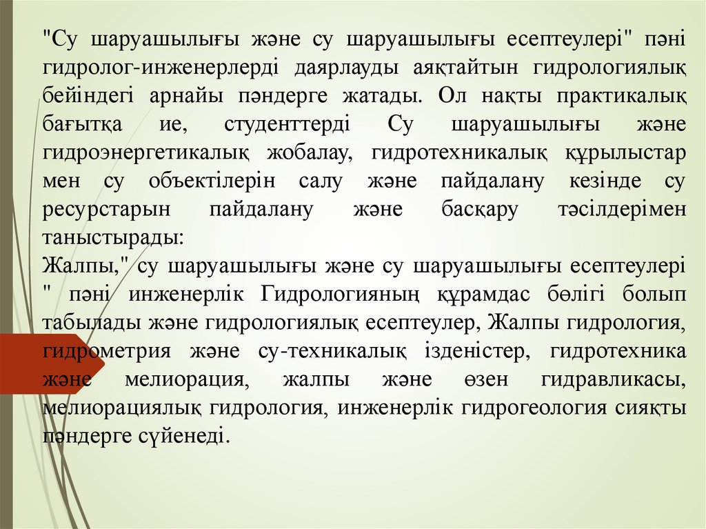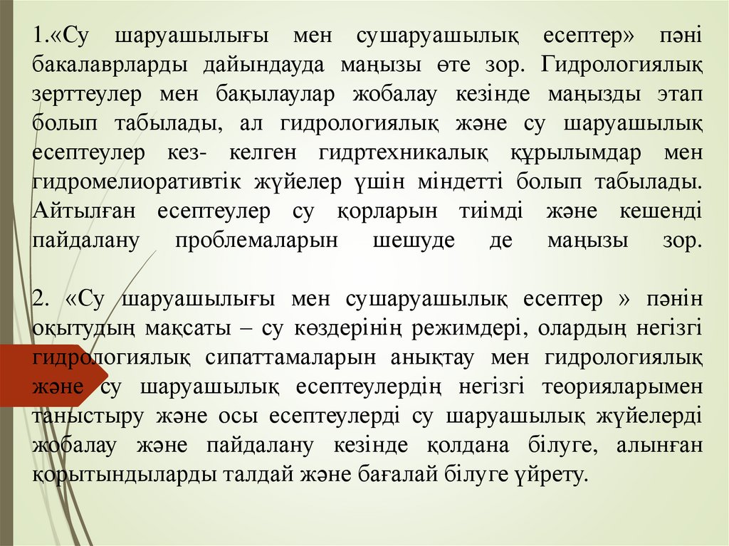 1.«Су шаруашылығы мен сушаруашылық есептер» пәнібакалаврларды дайындауда маңызы өте зор. Гидрологиялық