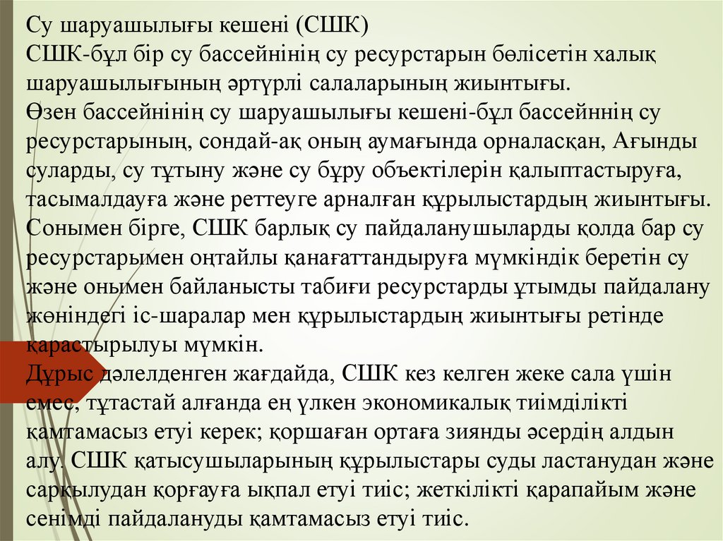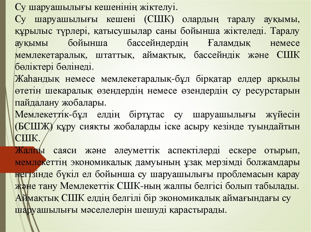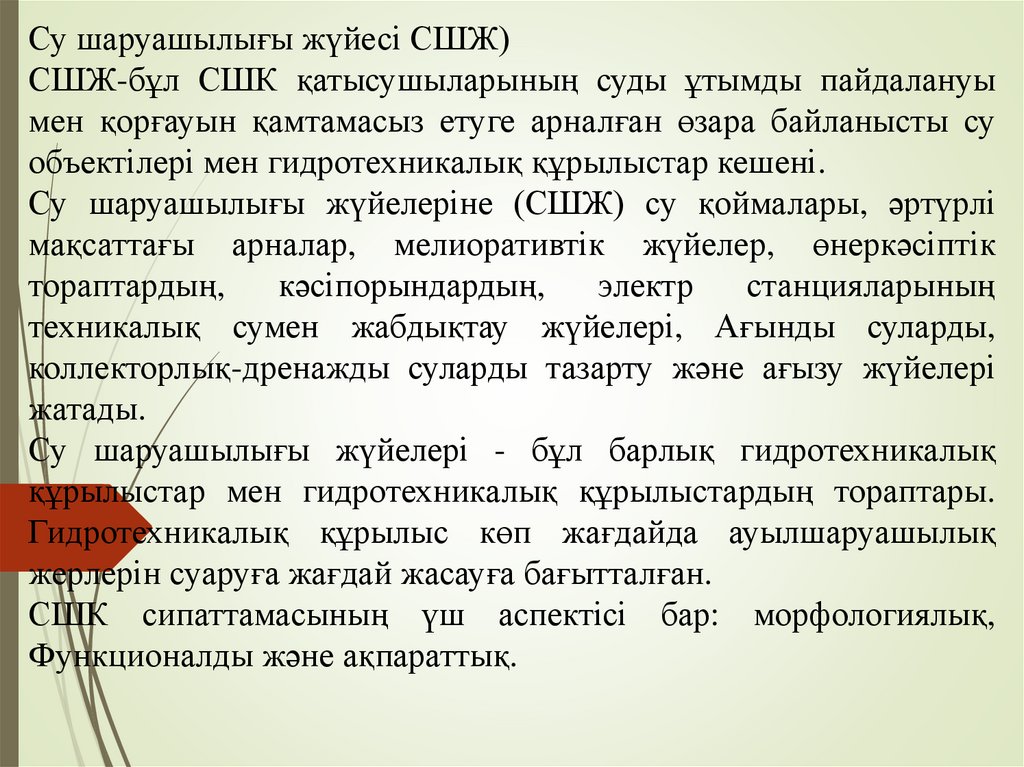 Су шаруашылығы жүйесі СШЖ)СШЖ-бұл СШК қатысушыларының суды ұтымды пайдалануы