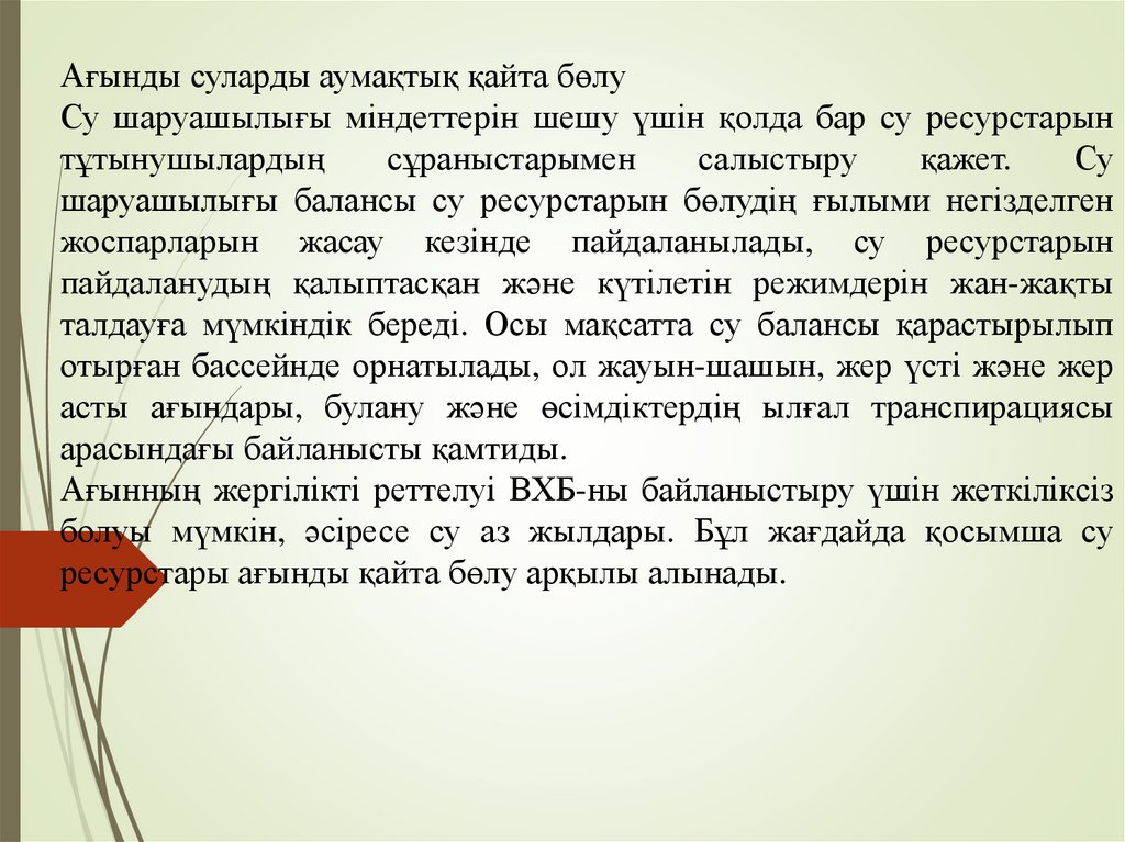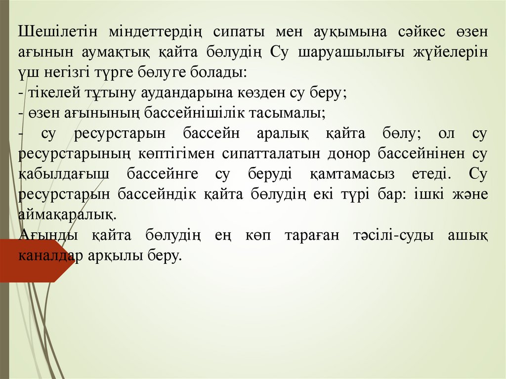 Ағынды суларды аумақтық қайта бөлуСу шаруашылығы міндеттерін шешу үшін қолда бар су ресурстарын