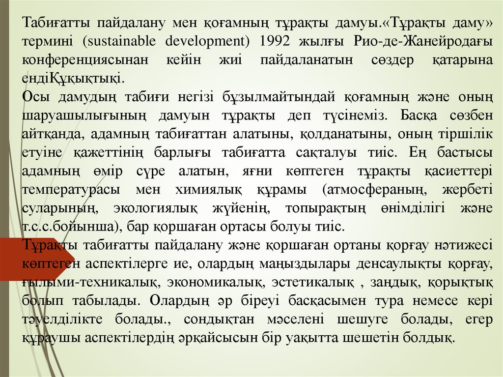 Табиғатты пайдалану мен қоғамның тұрақты дамуы.«Тұрақты даму»термині (sustainable development) 1992 жылғы Рио-де-Жанейродағы