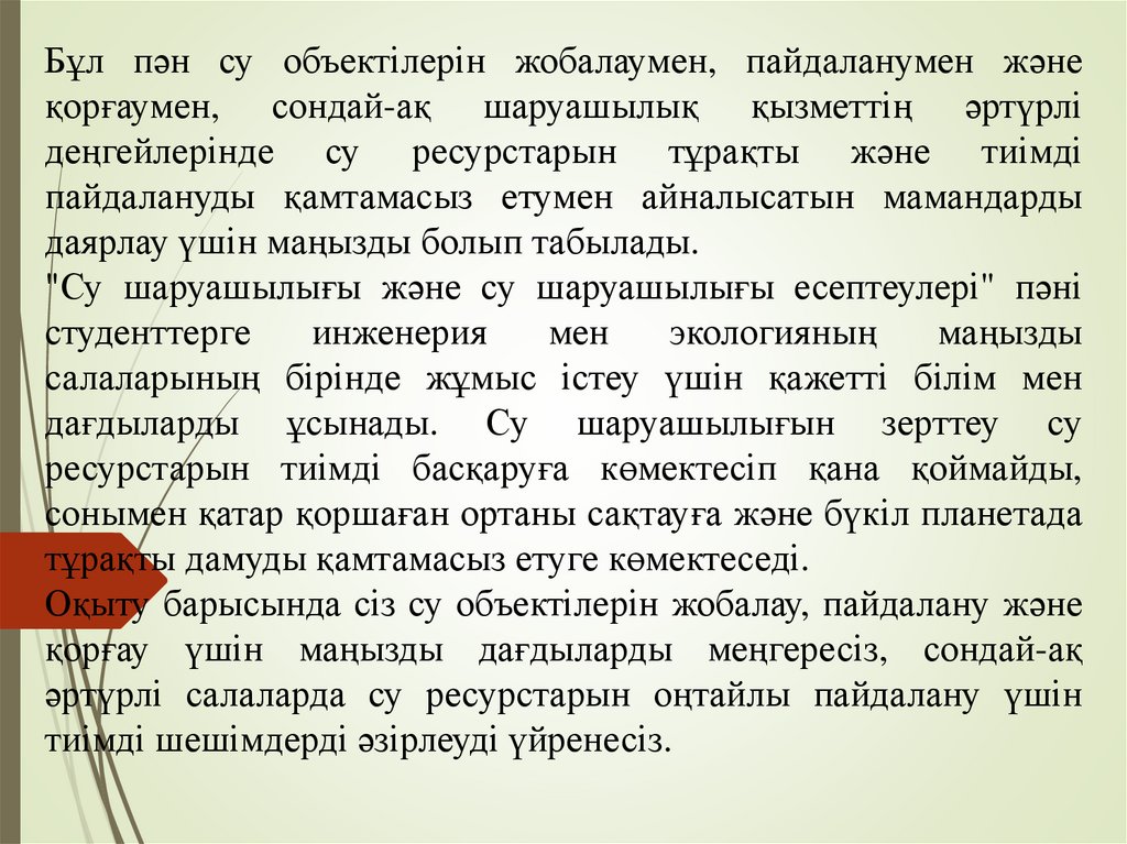 Бұл пән су объектілерін жобалаумен, пайдаланумен жәнеқорғаумен, сондай-ақ шаруашылық қызметтің әртүрлі