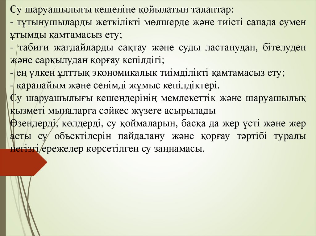 Су шаруашылығы кешеніне қойылатын талаптар:- тұтынушыларды жеткілікті мөлшерде және тиісті сапада сумен