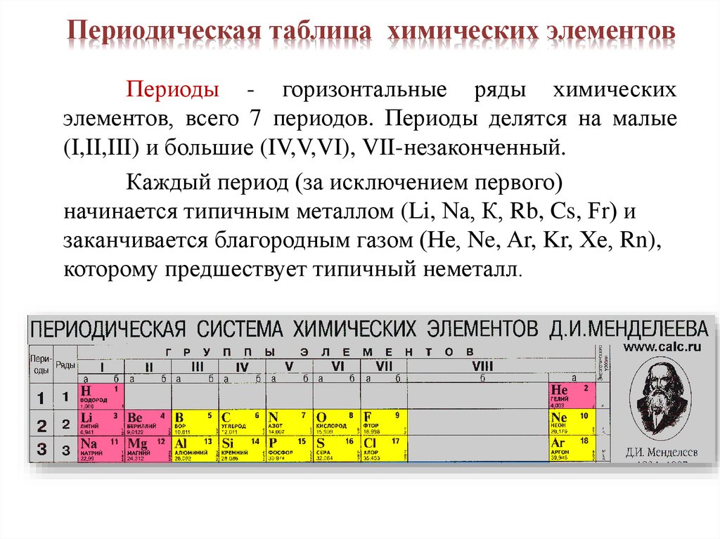 элементов, всего 7 периодов. Периоды делятся на малые