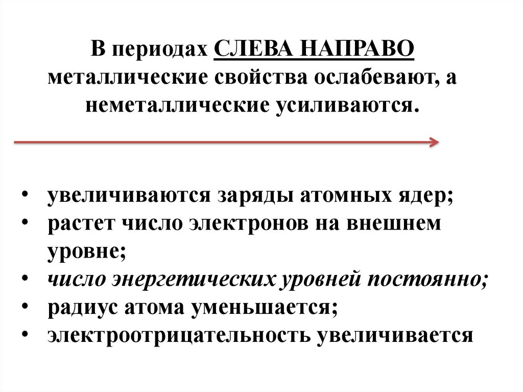 В периодах СЛЕВА НАПРАВОметаллические свойства ослабевают, а