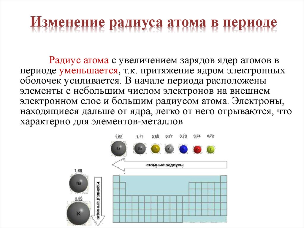 Изменение радиуса атома в периодеРадиус атома с увеличением зарядов ядер атомов в