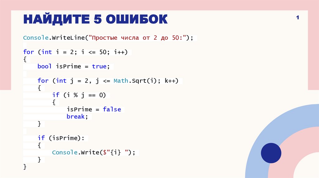 НАЙДИТЕ 5 ОШИБОКConsole.WriteLine("Простые числа от 2 до 50:");